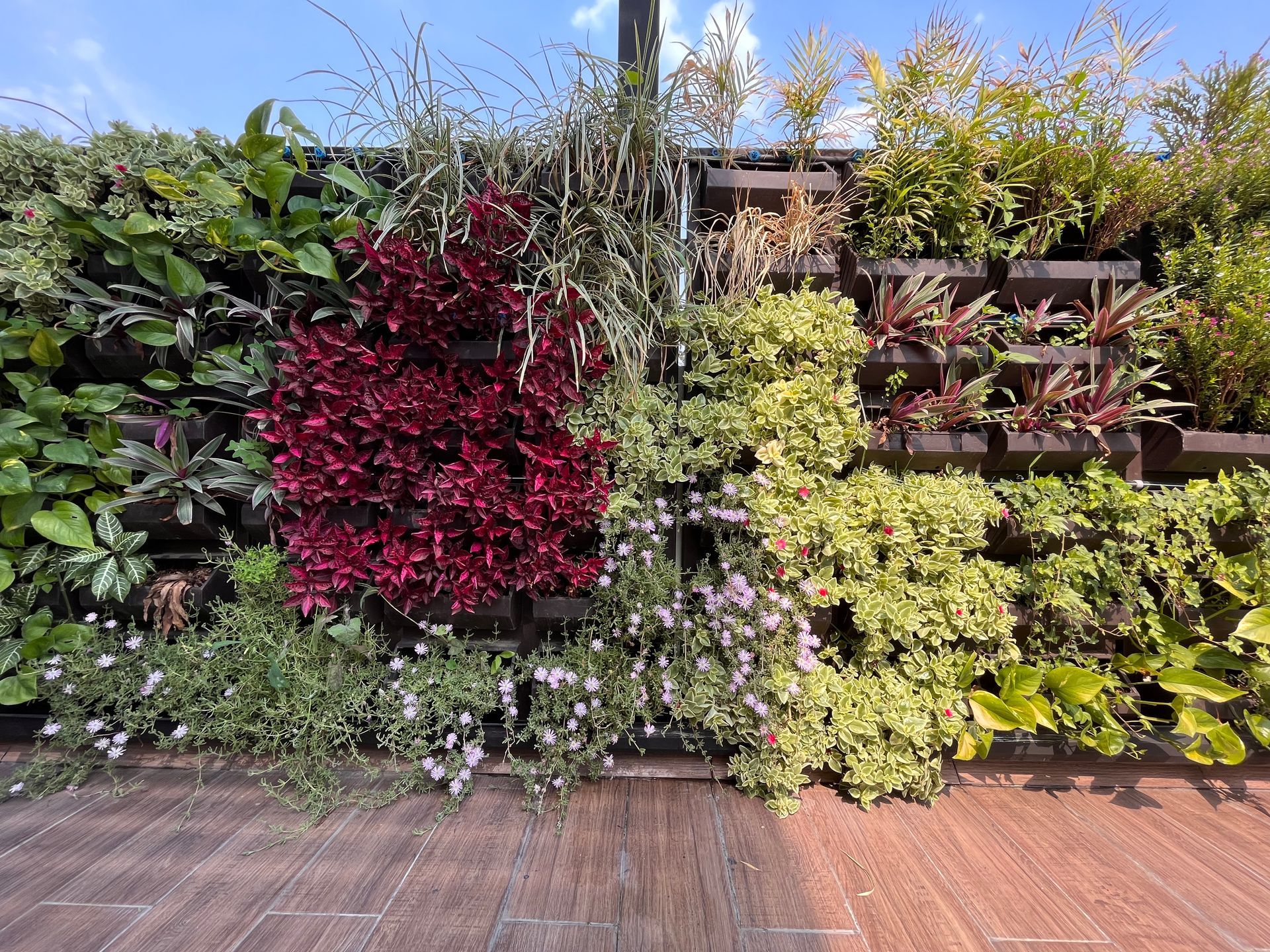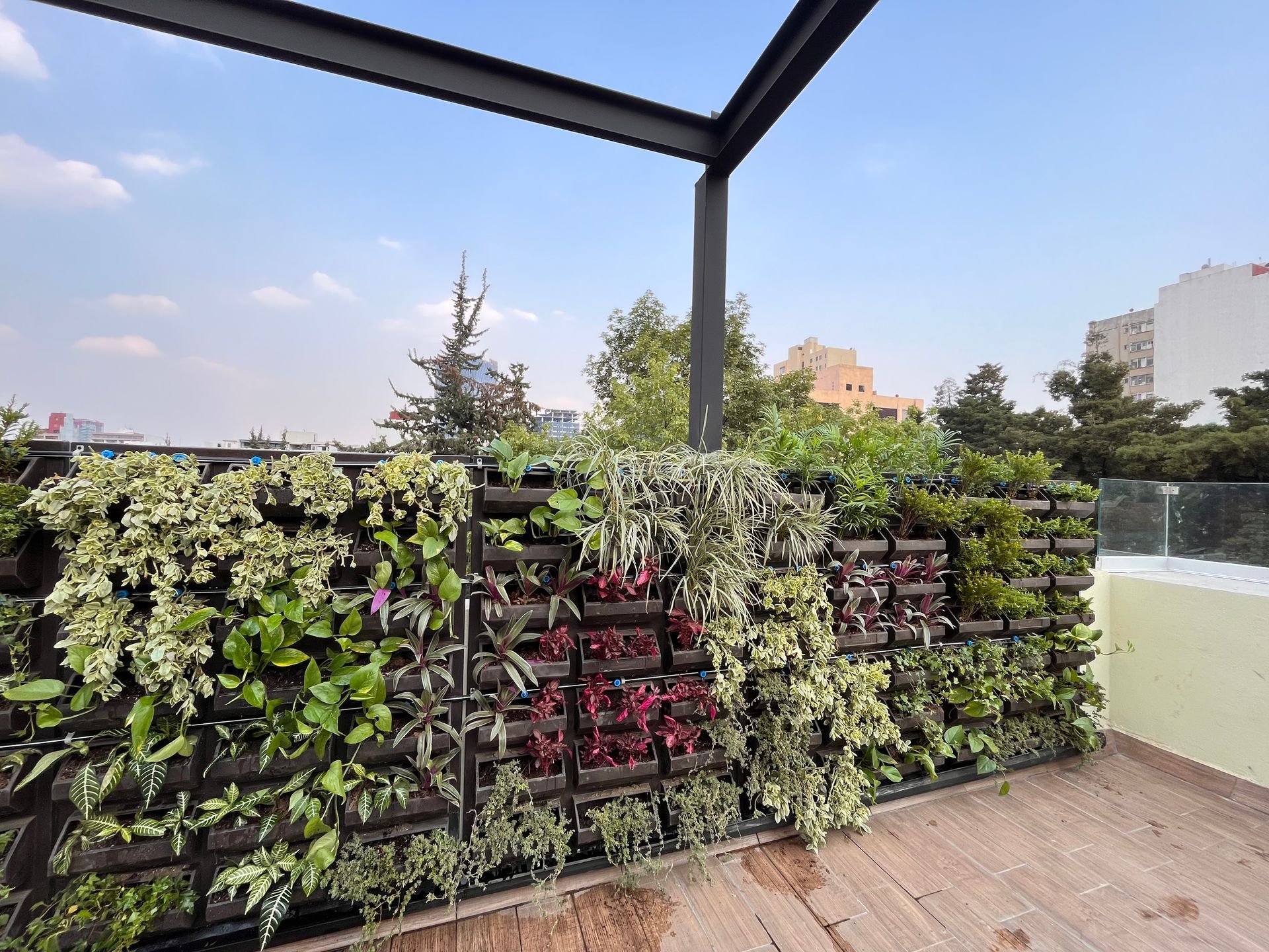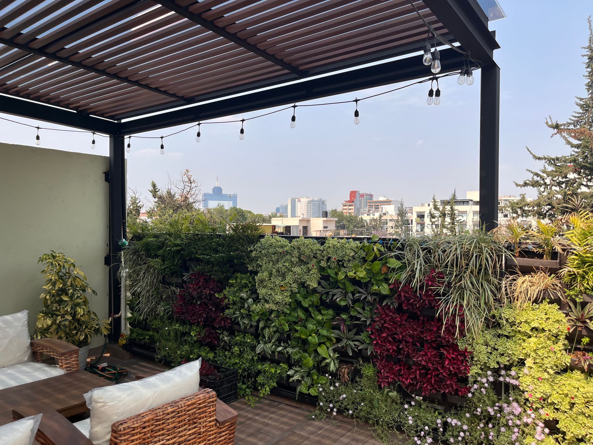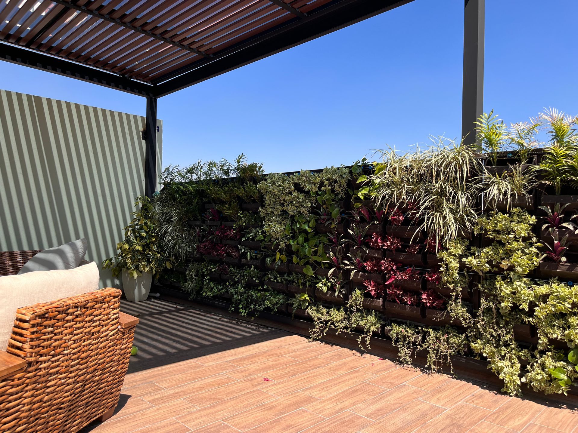 La terraza se transformó en un refugio íntimo que aprovecha al máximo la luz natural y las transiciones del día. Una pérgola retráctil permite modular las sombras y la temperatura del espacio, mientras que un muro verde natural funciona como límite visual, aporta frescura y ayuda a crear un microclima que envuelve el ambiente.